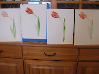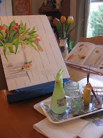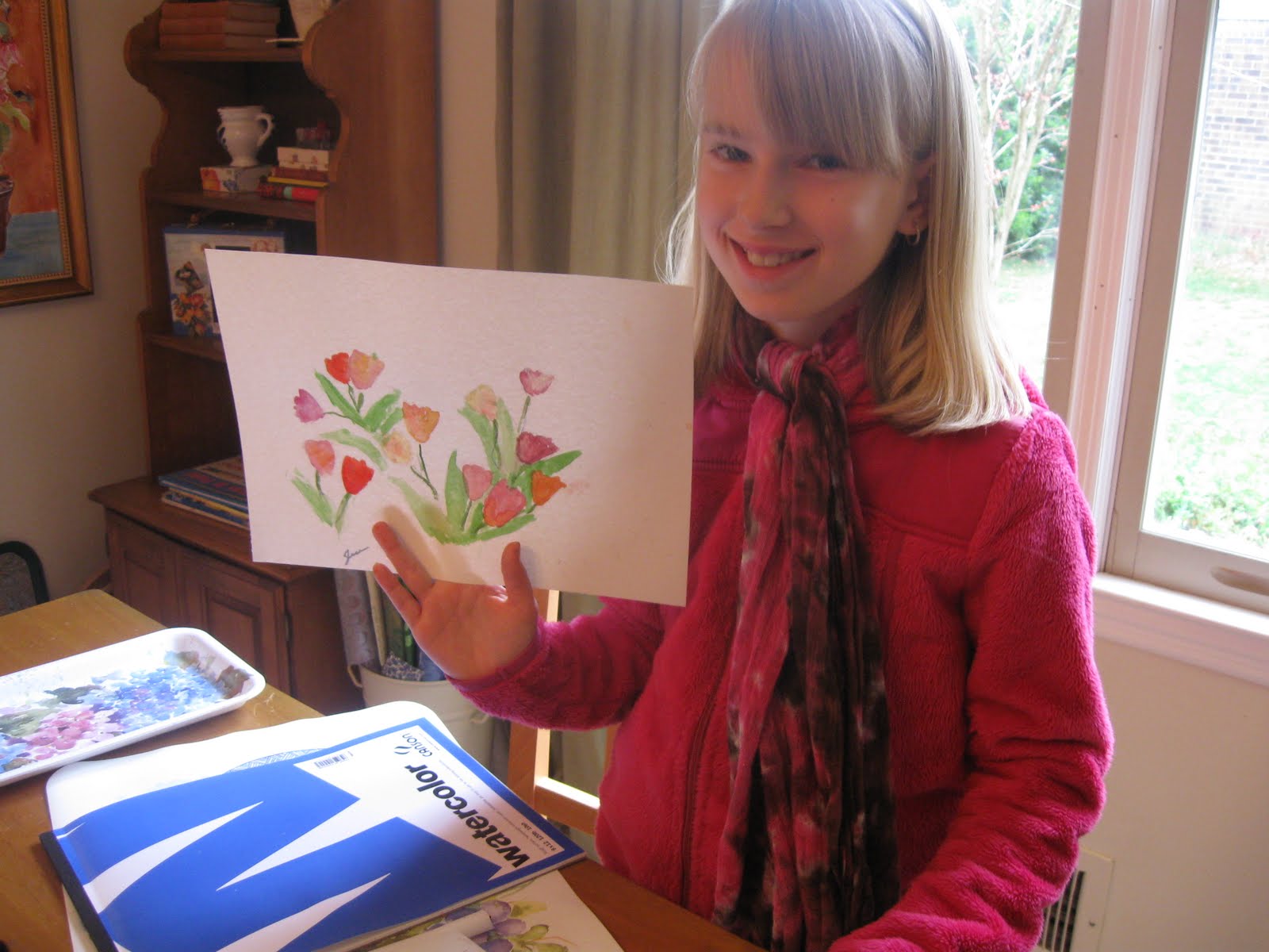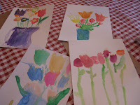 My KinderArt students concentrated on taking care to clean their brushes well every time they changed colors, but they worked quietly and steadily with loose brushstrokes to create a bouquet of flowers. While my Intermezzo ladies worked in deep concentration for over an hour to painstakingly produce a single tulip, more of a botanical study than a still life study.