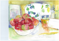 A VISIT WITH CEZANNE IN MY KITCHEN. My watercolor class recently spent a session “painting with Cezanne”. Instead of reproducing one of his works, and rather than paint the Still Life we set up for our class, I chose to do my own “study”, pretending he was looking over my shoulder as I sipped my mug of Earl Grey and had a TCM marathon day. Even though I may see things differently than Cezanne saw them, his techniques and treatment of ordinary kitchen elements definitely challenged me to expand my personal style.