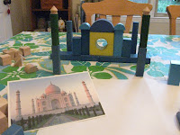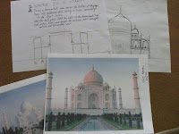 TAJ MAHAL, Architecture Exercise. Students readily recognized that this “famous building” is a good example of Symmetry. We discussed how to draw it, focusing on breaking it down into shapes. My grand children’s building blocks were used to “construct” a simple model of the Taj Mahal’s basic shapes: rectangles, half circles, squares, and cylinders. Some of the Middle School students opted to use a ruler and follow a few precise measurements designed for the size of paper they used. Other students used a rule just to draw the horizon line and then using a rectangle template in the middle they were able to “construct” and draw the rest of the building, following the symmetrical design portrayed in the one-point perspective image.