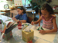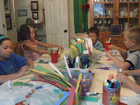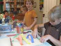 “The work of children is play.” Using long strips of colorful paper, each KinderArt Home School student creatively constructed a playground. This project involves lots of cutting, taping and paper folding. One idea usually led to another and soon their baseboards were covered with imaginative playground elements.
