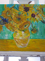 “AFTER VAN GOGH”. Study of one his Sunflower paintings I saw in the Neue Pinakothek art museum in Munich last Spring. One important thing I learned from this exercise is that I needed to use yellow pigments closer to the ones Van Gogh used. I wasted a lot of energy, effort and paint trying to mix/find his yellows!