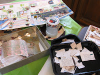 Some time ago, I started sorting my collage papers by colors and values, creating a palette similar to my watercolor palette. Greens and blues are the biggest pile, and I have bright little trays of reds, oranges and pinks, and small boxes of yellows and browns. My stash of printed words (a lot of pages torn from foreign magazines and travel brochures) and maps is beginning to grow like Kudzu and creep out of the boxes on my shelves. Not to mention the overflowing tins of postage stamps and candy wrappers and . . . you get the picture!