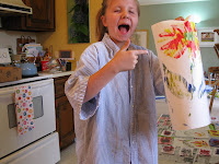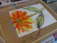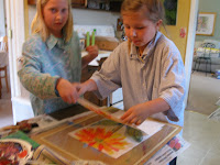 PAINT DAY for Bell’Arte students. Each student made a monoprint of a Gerber daisy. My acrylic flower painting was laid on the table under an 18X20 sheet of glass. As the young artist painted his rendition of the flower with primary colors of tempera, an original piece of art emerged within minutes. We all cried out “drum roll” and pounded the tabletop as the artist prepared to quickly lay down his plain sheet of paper on top of the still-wet paint and then peel it away. “Hey, it’s like peeling off a tattoo” exclaimed one of the children! Voila! A mirror image “print” of the flower painting appeared on the white paper. And then a ghosted second print, and sometimes even a third “ghost” image could be printed.