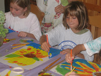 style of Van Gogh!IMPASTO recipe: 1/2 C. medium thick tempera paint + 1 Tbsp. white detergent powder (or cornstarch, white flour, etc.). Thin with water or add more powder to thicken. Scoop dollops of paint onto sytrofoam grocery trays, keeping colors apart. Apply paint to heavy paper or posterboard using a popscicle stick to texturize the paint– make lines, squiggles, shapes, etc.