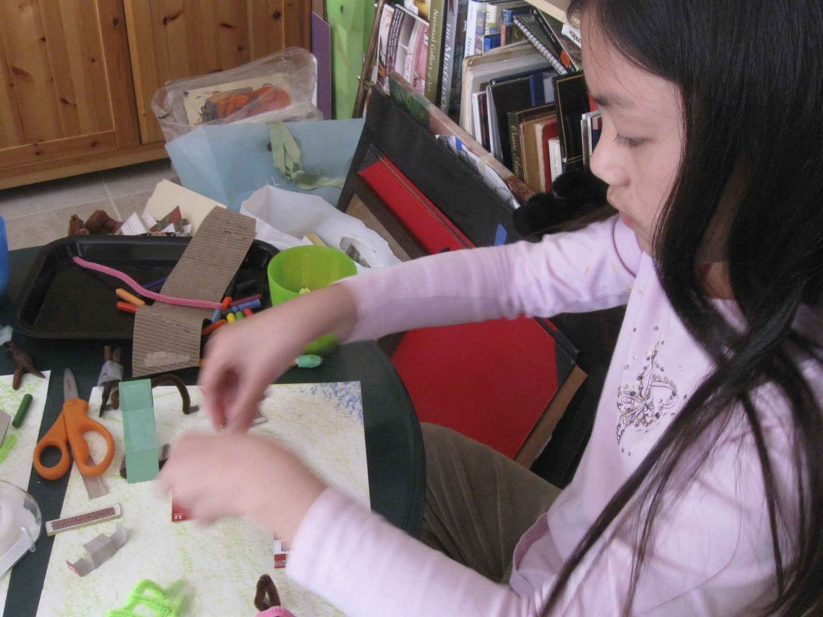 Each child started with a sheet of 140# watercolor paper as a support base. After mapping out a plan, crayon rubbings gave their foundation some texture. Next, strips of colored paper and other scrap papers, chenille stems, foil, brads, etc. were put to good use with imaginative creations. Challenged to create a park and/or playground, swings and slides started emerging, just the right size for Lego people! What did they use to “attach” their creations? Stapler, scotch tape, brads, and glue. Fan folding was a popular approach to creating stairs.