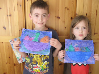 In KinderArt we added a new twist to it by crumbling up the paper in our fists before painting over the crayon colored “painting” with dark blue or purple Tempera paint. Finished product closely resembles a canvas painting.