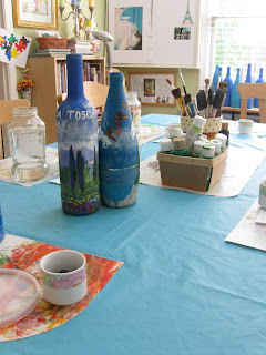 After soaking the labels off of the bottles and drying them thoroughly, I applied a base coat of latex paint (white or cream color). When dried, a coat of acrylic paint was applied—in this case, blue as background color for our Landscape theme. My inspiration bottles included a Tuscany scene on a wine bottle and a Florida beach scene on a Perrier water bottle.