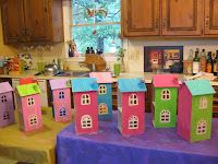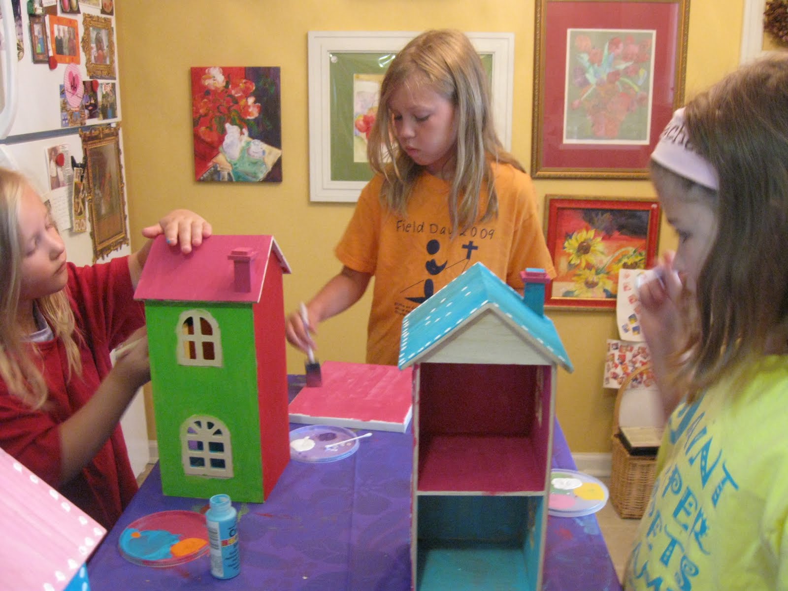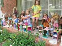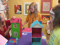DOLLS AND THEIR HOUSES. The first project at AG Art Camps this summer–painting doll houses for our dolls’ dolls! Doesn’t it look like a row of beach houses at Seaside? Love the color combinations each girl chose.