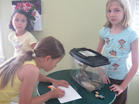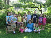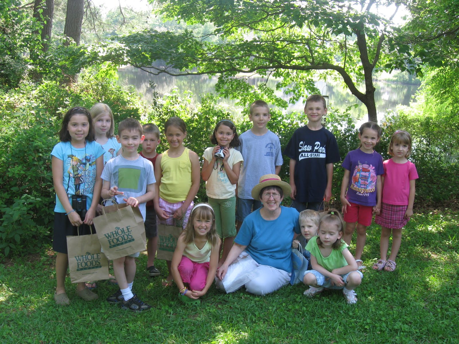 EARLY SUMMER NATURE STUDIES. KinderArt students enjoyed gathering nature study items in brown bags. The combination of mosquitos and high humidity forced us back inside to make sketches of leaves, twigs, rocks and flowers we found in the garden by the pond. One student brought Jack, her pet frog, and let the other students observe and draw a real-live-frog! We are compiling our Nature Study drawings in a portfolio.